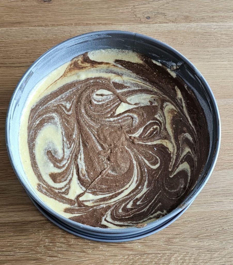 8️⃣ Engrasa el molde con mantequilla y vierte ambas mezclas alternándolas. removiendo suavemente para realizar un “dibujo” de mármol. 🎨