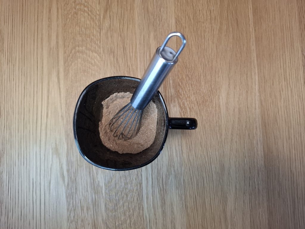 1️⃣ Mezcla los ingredientes secos en la taza: harina, cacao, sal, levadura y azúcar.