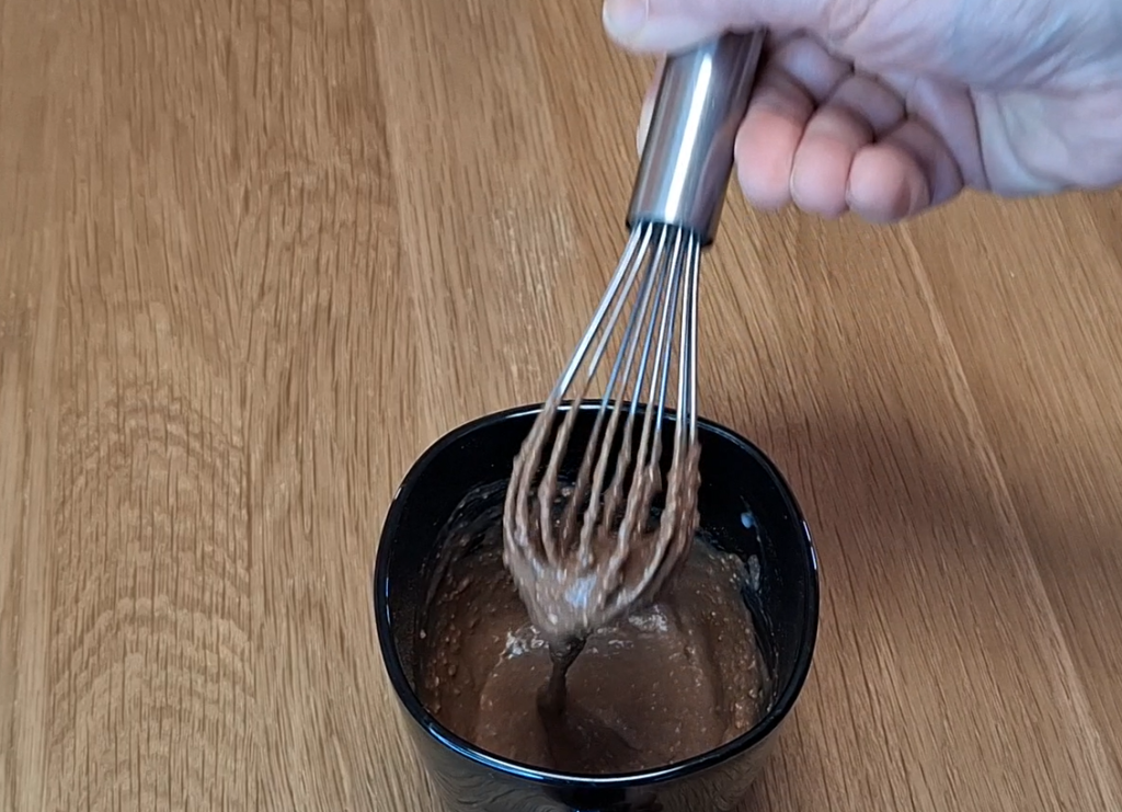 2️⃣ Añade los ingredientes líquidos: leche y aceite de coco. Remueve bien con las varillas hasta que quede una masa homogénea.