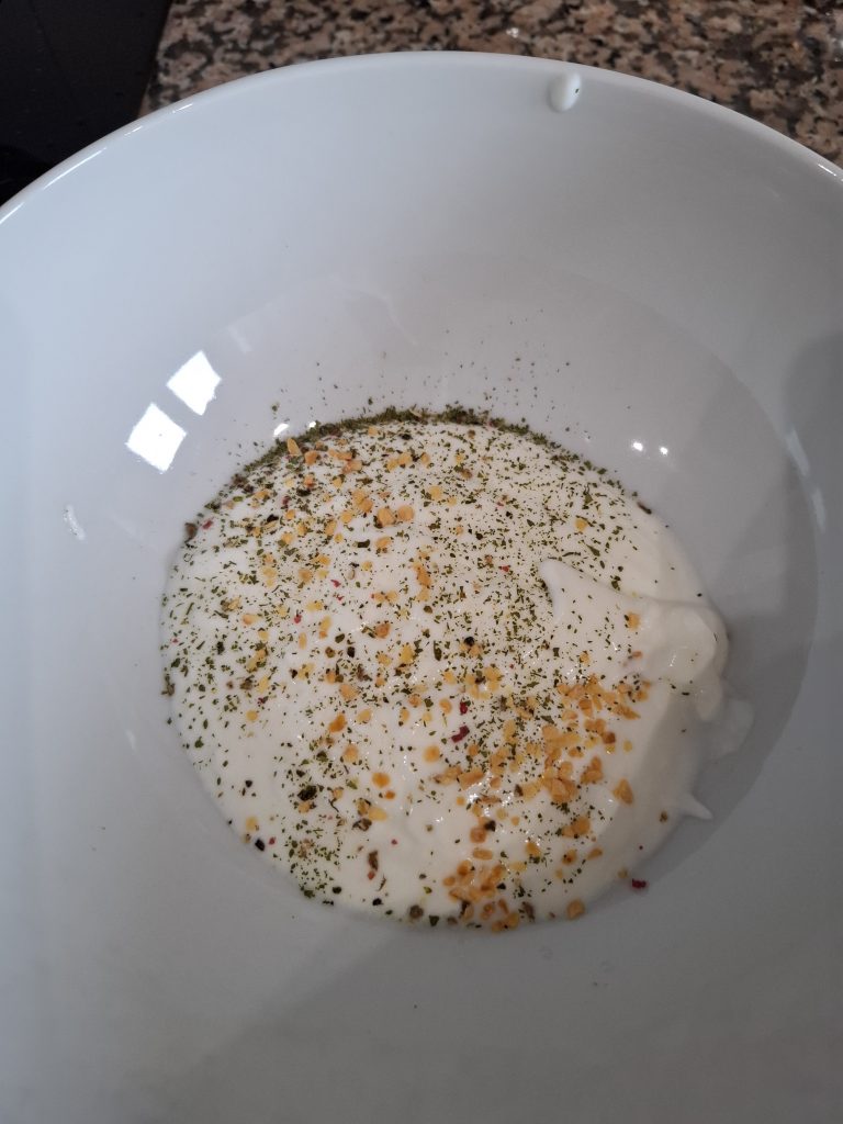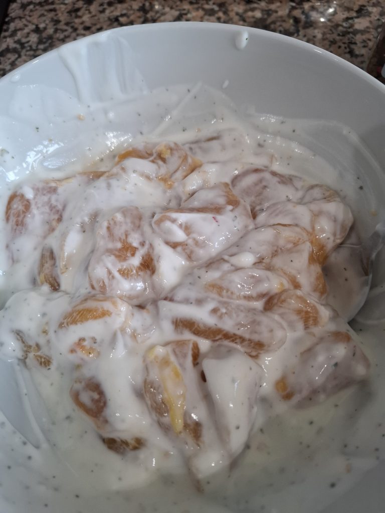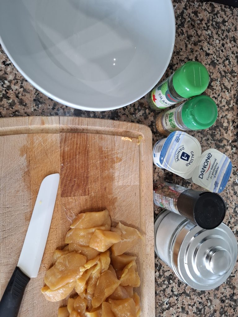 En un bol, mezcla el yogur con la sal, la pimienta, el ajo y las especias. Añade el pollo troceado y remueve bien. Tapa con film y guarda en la nevera al menos 30 minutos. - Haz el rebozado: