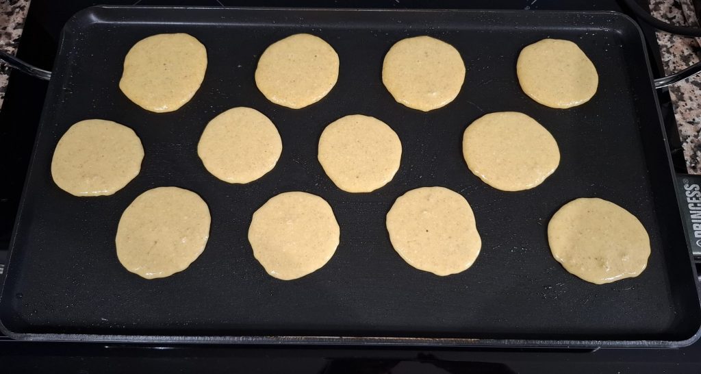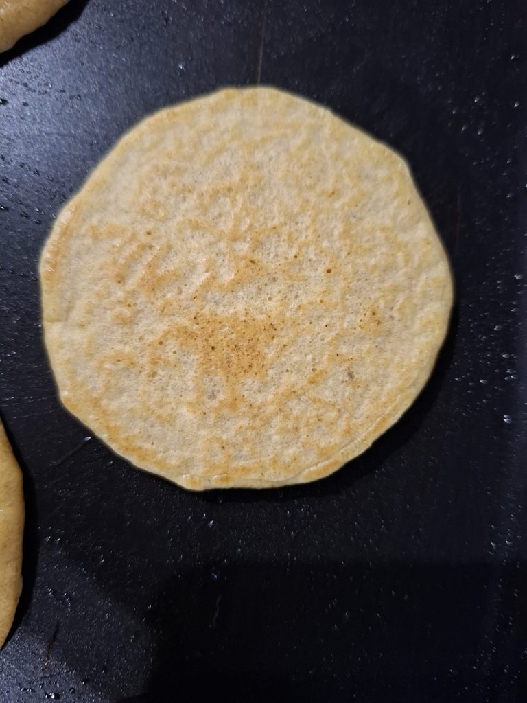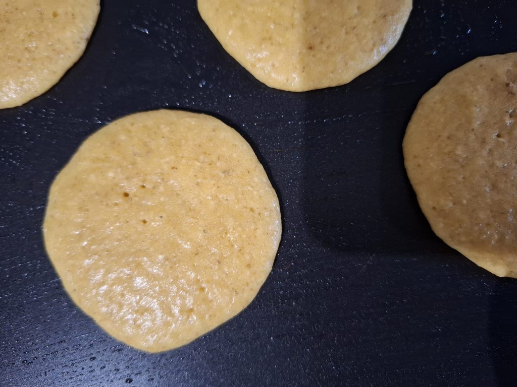 - Cocina los pancakes: Precalienta una sartén antiadherente a fuego medio. Unta con un poco de aceite de coco si es necesario. Vierte una cucharada de la mezcla por pancake, formando círculos pequeños.